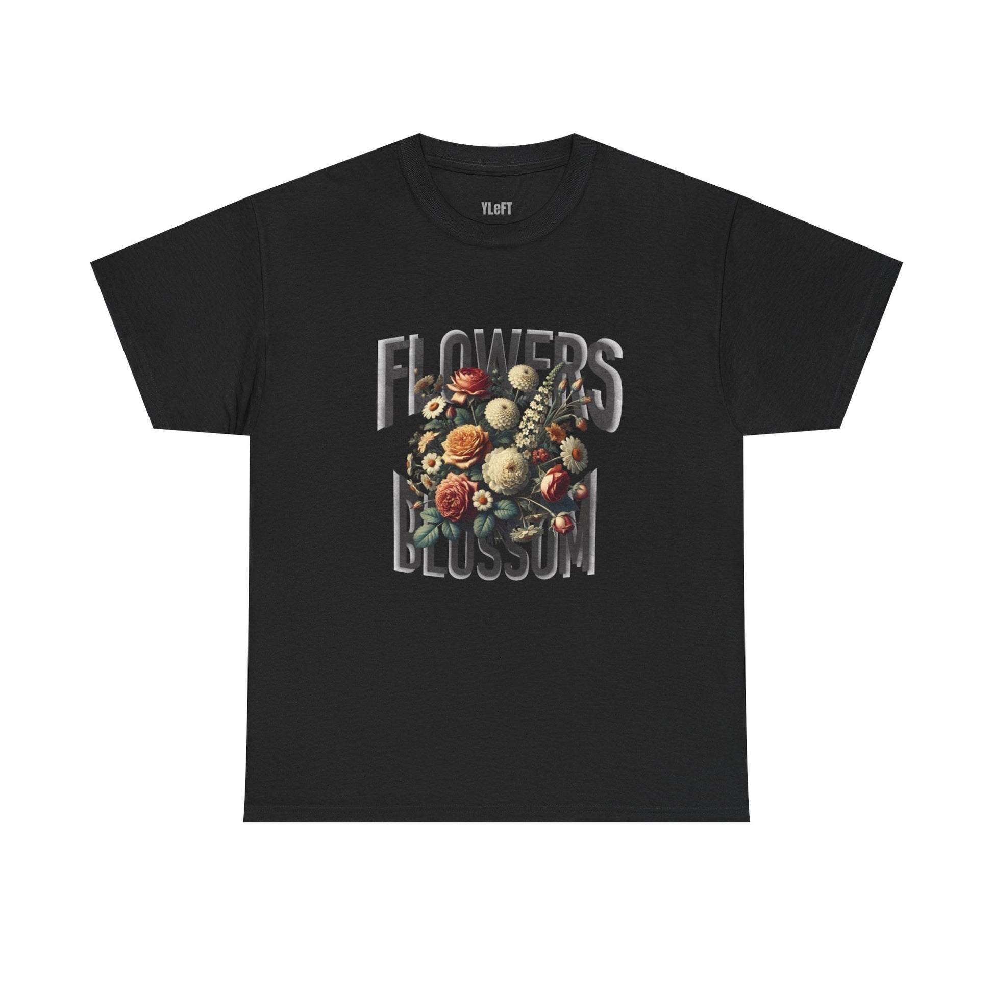 The Flower Blossm T-shirt is crafted with 100% cotton, features a vibrant floral bouquet framed by the phrase “FLOWERS BLOSSOM” in bold, mirrored text. Set against a black backdrop, it’s a powerful reminder that growth and beauty take time. Made for those who rise through the shadows and bloom anyway.