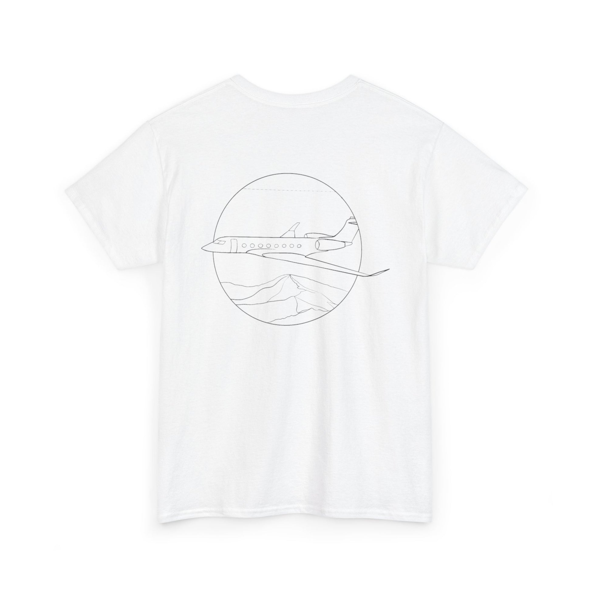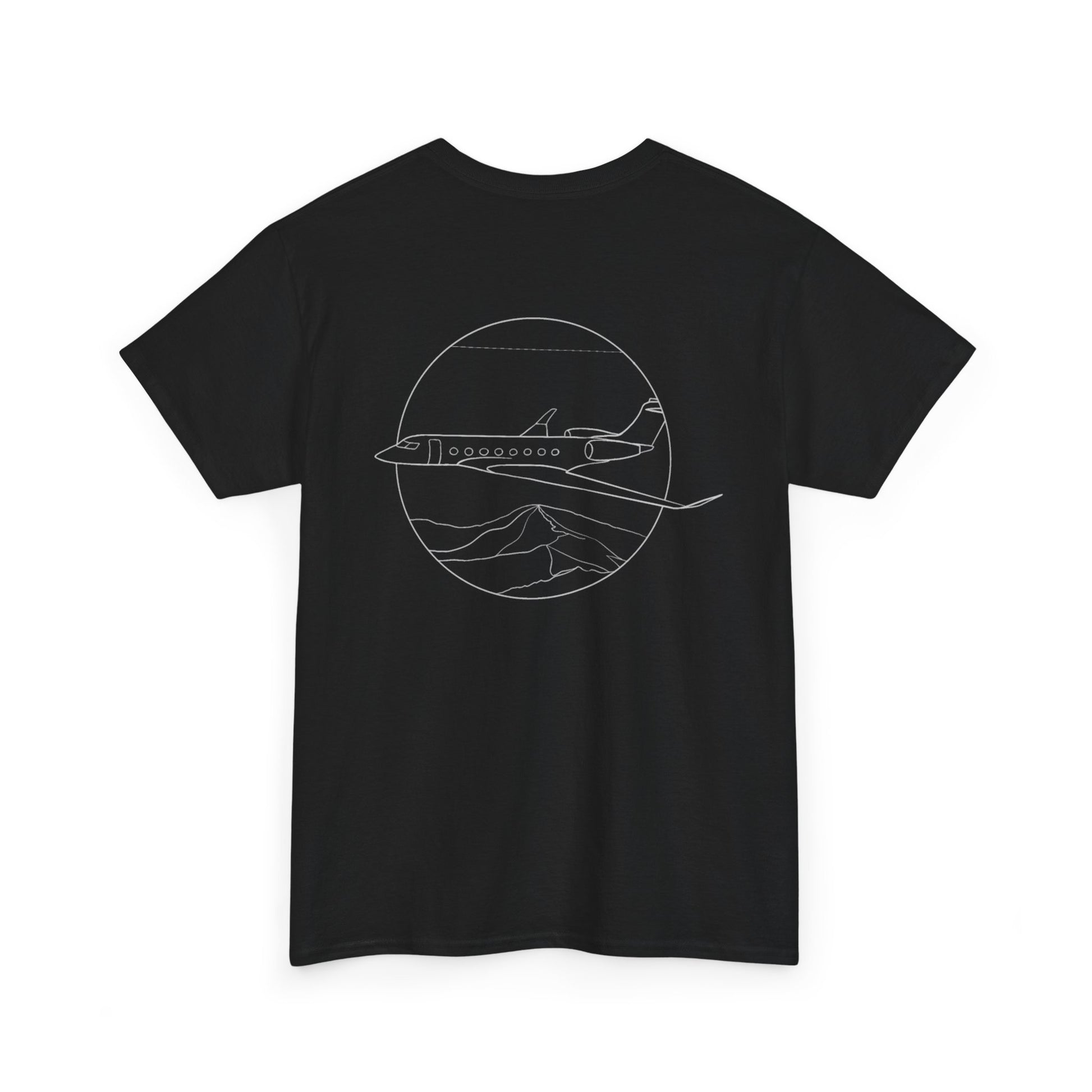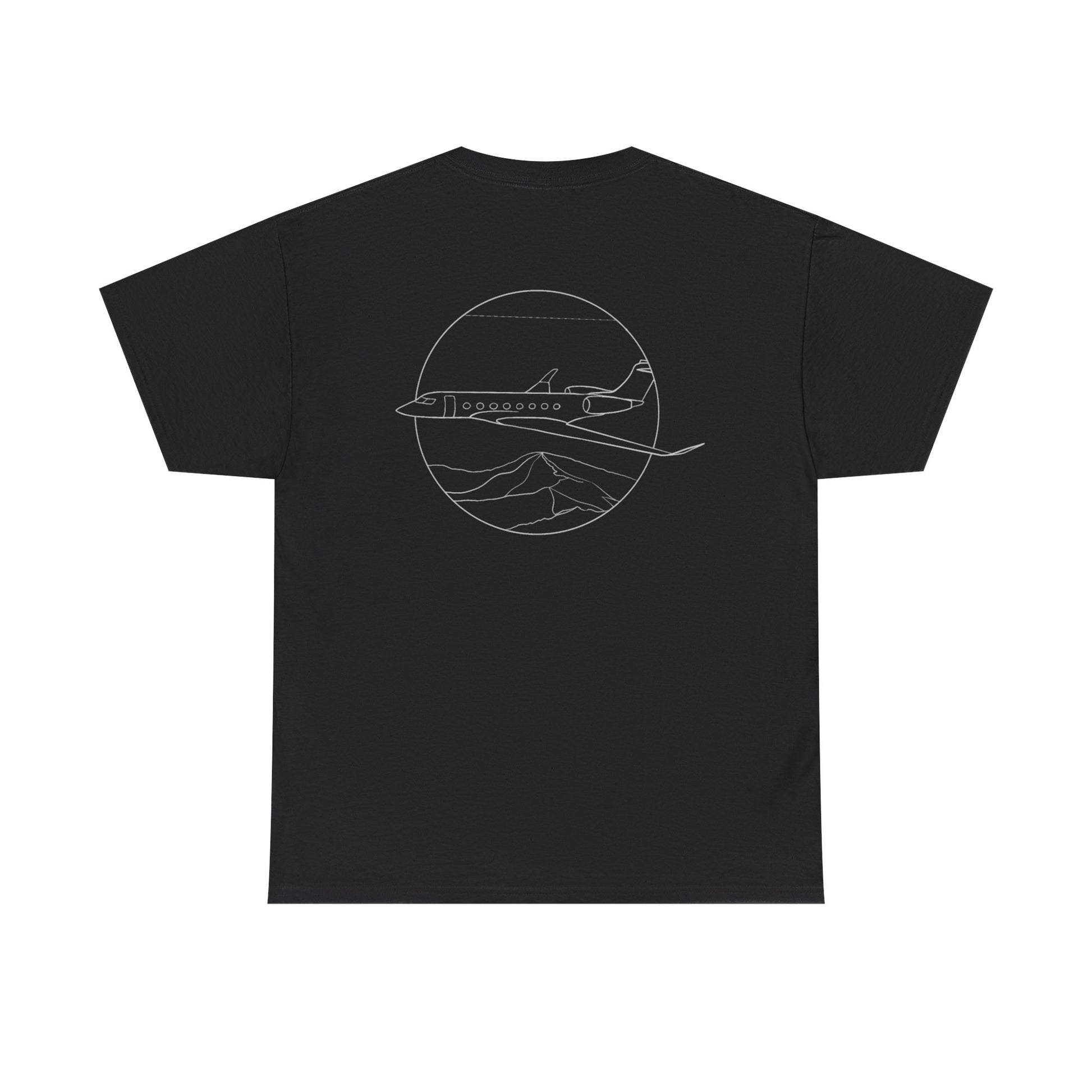 This sleek tee showcases a white line-art design of a private jet soaring above mountain peaks. Framed in a clean circular layout, the design captures freedom, ambition, and motion. The front is left blank to let the powerful back design speak for itself.