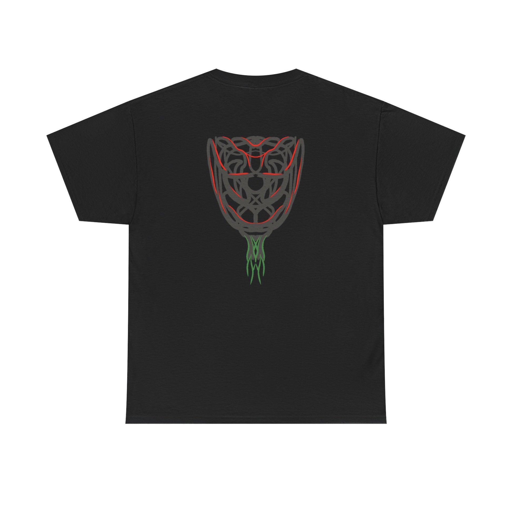 A black t-shirt displaying an abstract graphic of a rose in dark grey with red outlines and green stem details. The unique, artistic style gives this classic floral design a modern edge.