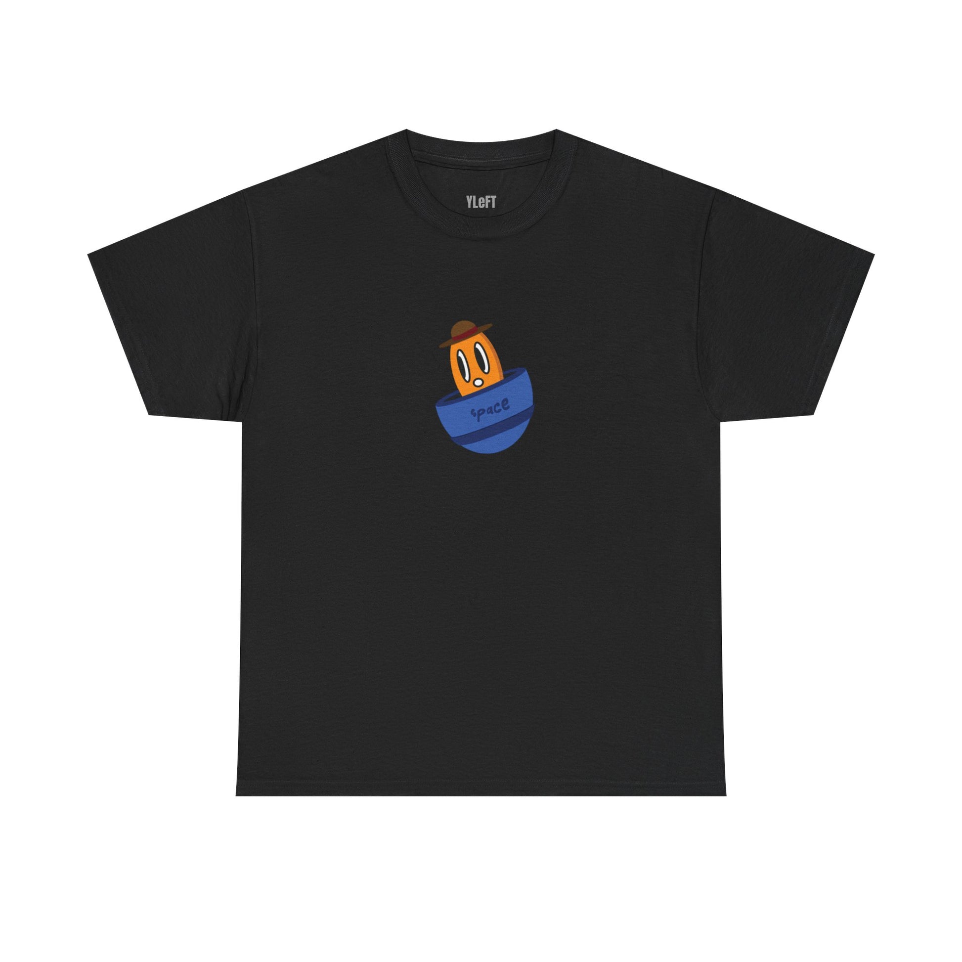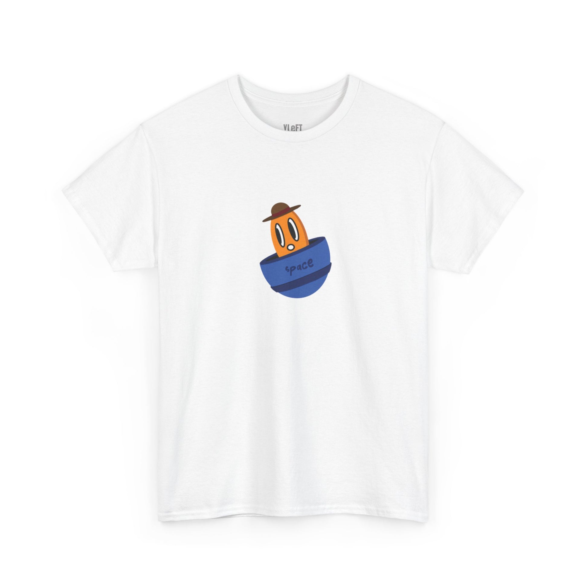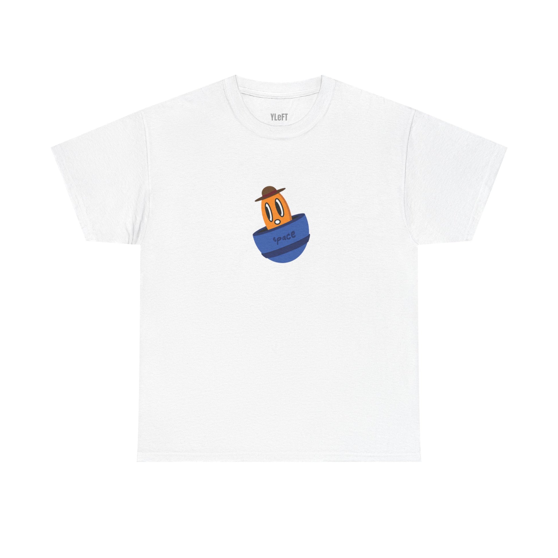 A white t-shirt with a cute, cartoonish orange character wearing a brown hat and sitting in a blue spaceship with the word "space" written on it.